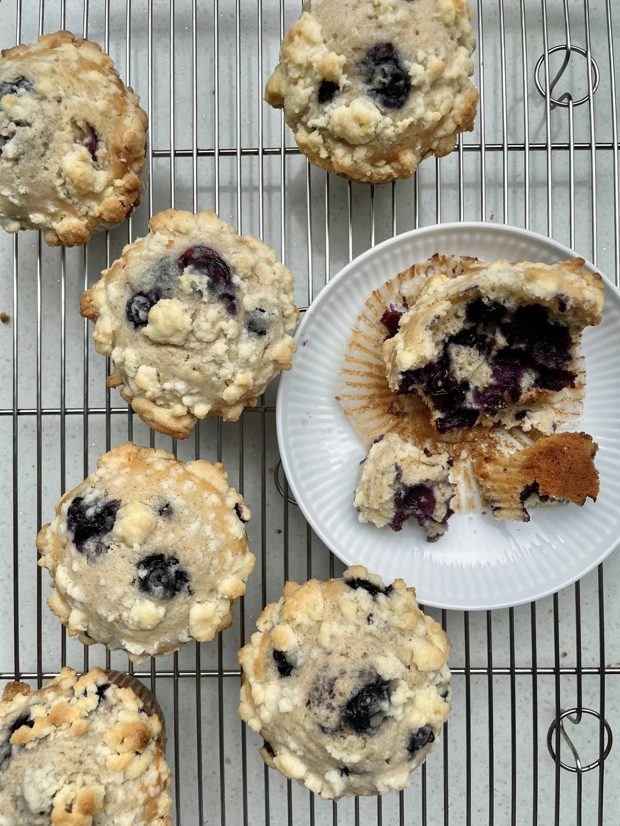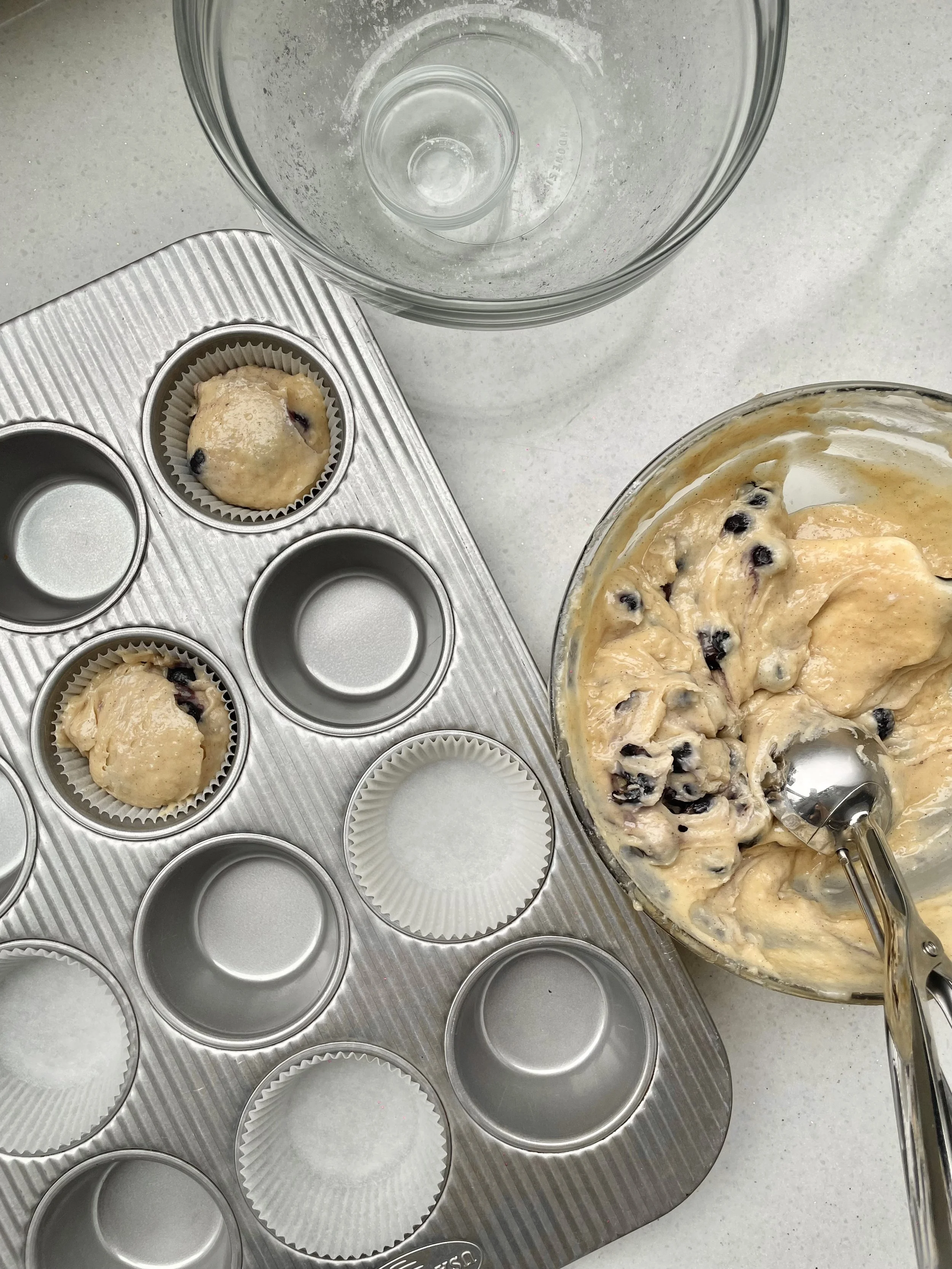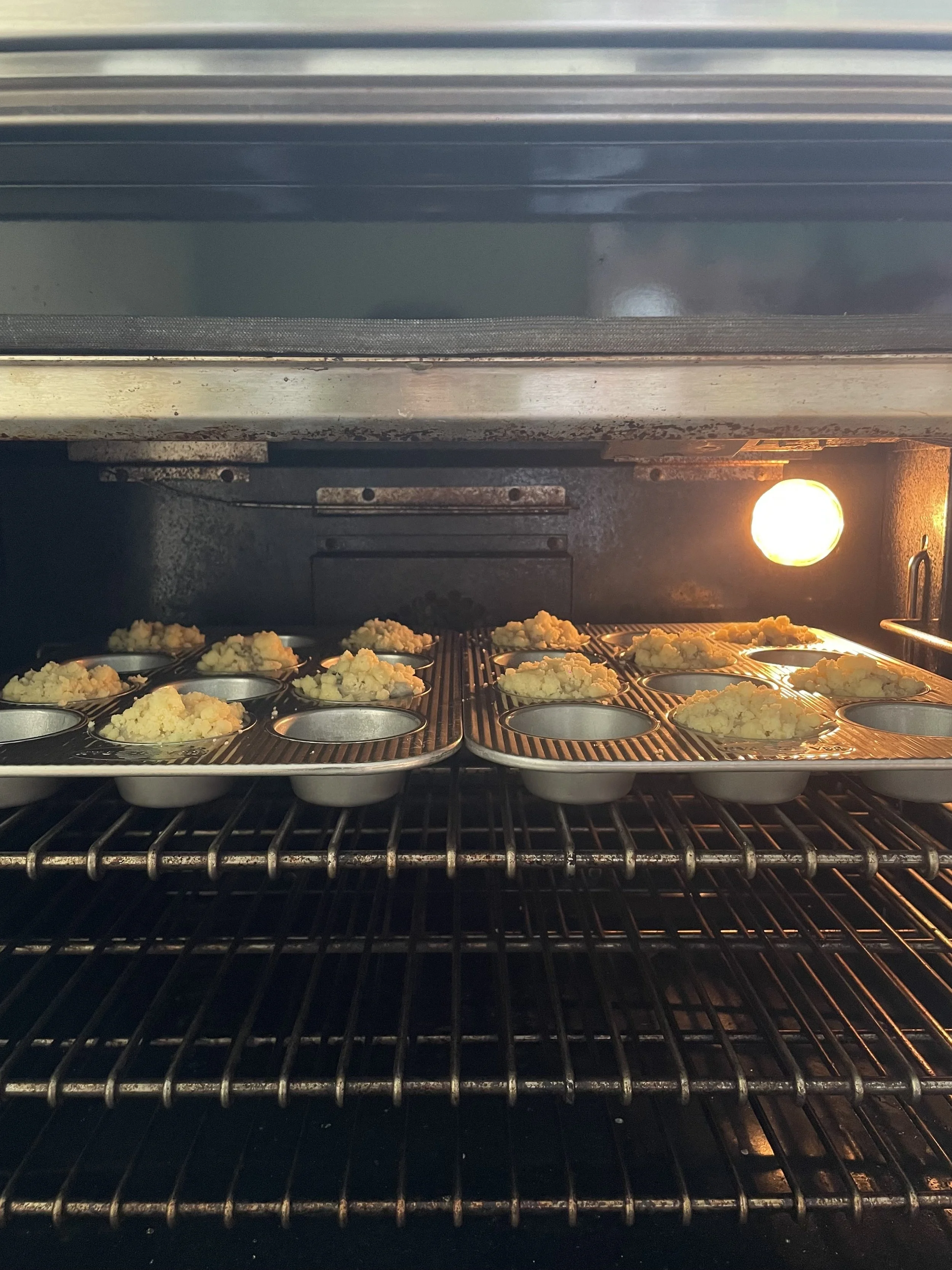 Scoop the batter into muffin tin and top with crumble, then bake for 10 – 25 mins