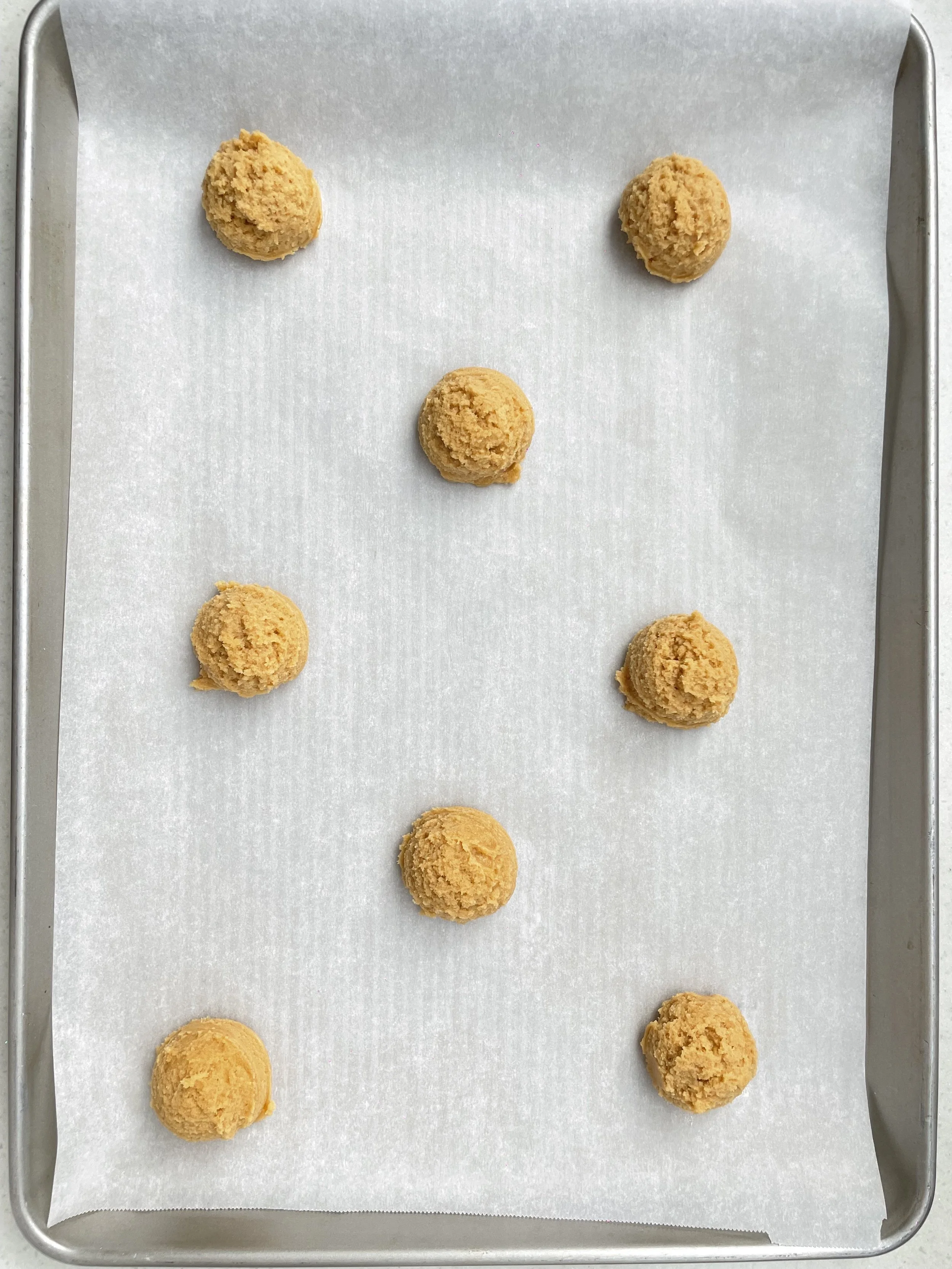 Scoop out the cookie dough balls, and press down with form